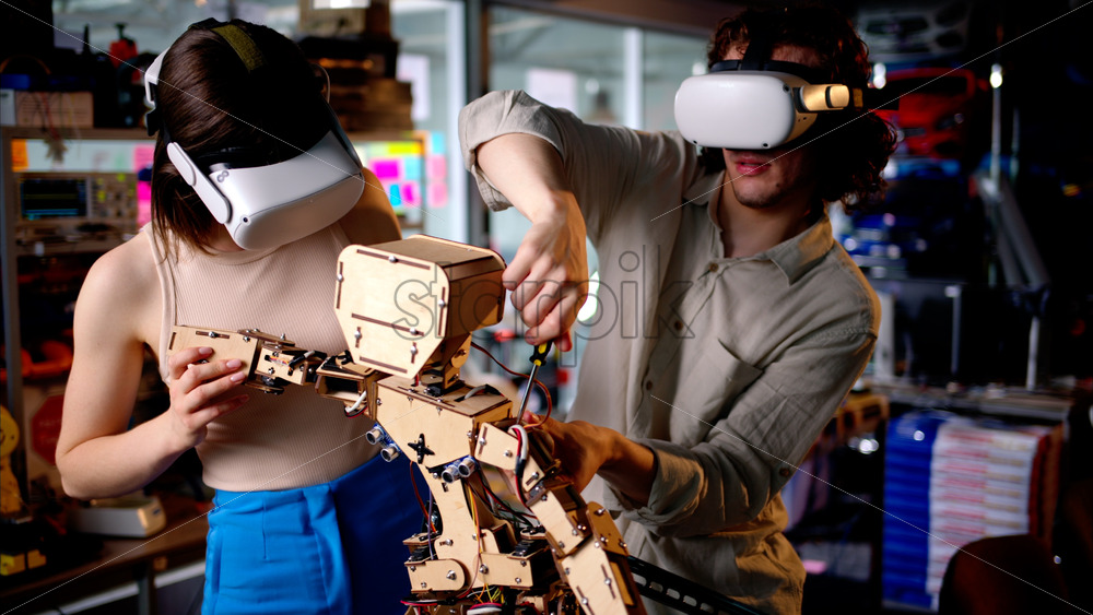 Home » Shop » photo » Two young engineers fixing a mechanical robot in the workshop, using VR virtual reality headsets
