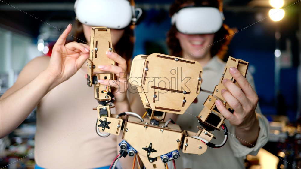 Home » Shop » photo » Two young engineers fixing a mechanical robot in the workshop, using VR virtual reality headsets