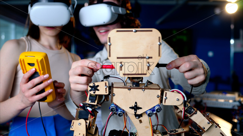 Home » Shop » people » Two young engineers fixing a mechanical robot in the workshop, using VR virtual reality headsets