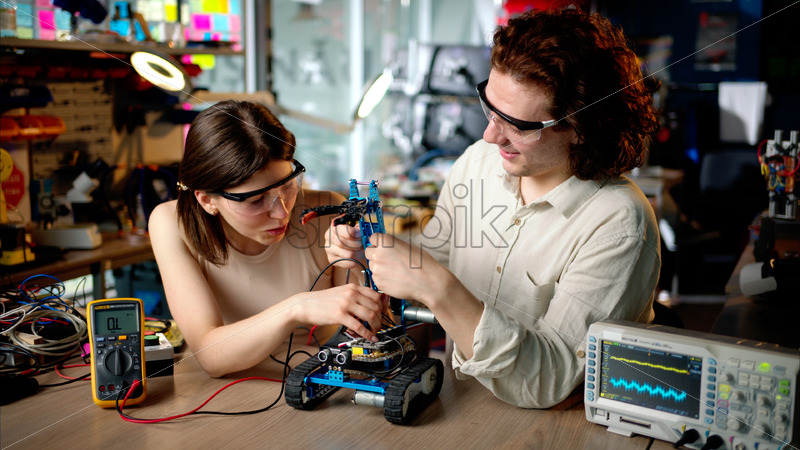 Home » Shop » people » Two young happy engineers fixing a mechanical robot car in the workshop, using VR virtual reality headsets
