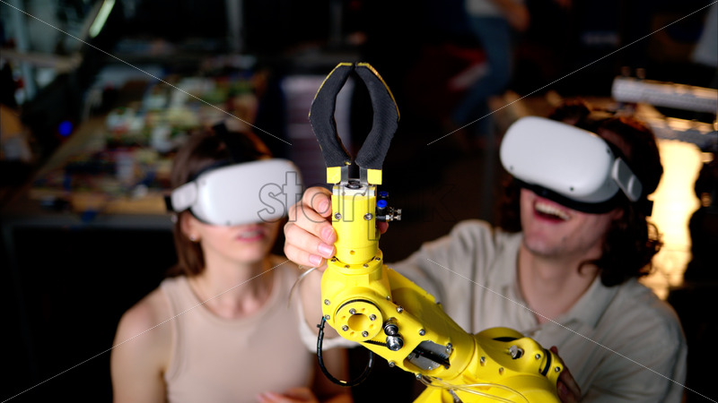 Two young happy engineers fixing an yellow robotic arm in the workshop, computer programming, celebrating success