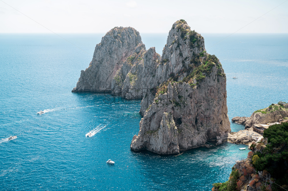 Home » Shop » photo » Tyrrhenian sea coast of Capri, Italy. Rocky cliffs, blue water, multiple floating boats, greenery
