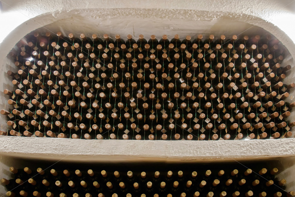CRICOVA, MOLDOVA – APRIL 6, 2021: Racks with bottles of wine in storage at the Cricova winery, Moldova. Walking visitors Royalty Free Stock Video Footage