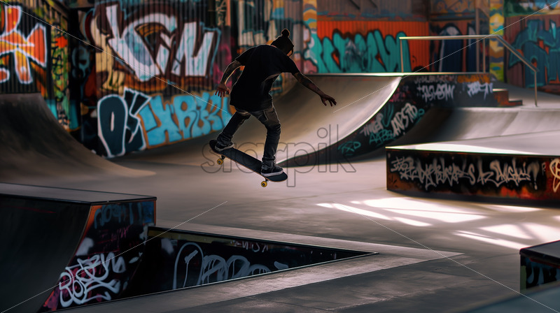 A skateboarder performing tricks in an urban skatepark, amidst graffiti-covered ramps and vibrant energy.