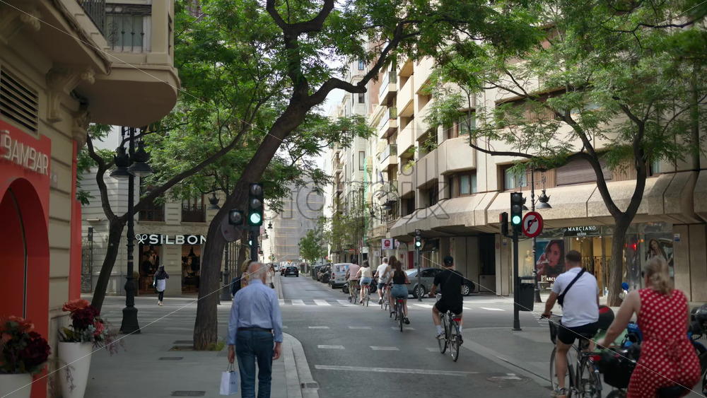 Home » Shop » 1 Video » Video – Valencia, Spain – May 28, 2025: Commuters and shoppers ride bikes through a green light on a tree lined avenue flanked by boutiques and mid rise residences