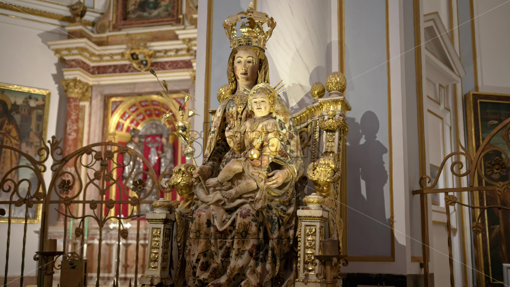 Valencia, Spain – May 28, 2025: Golden crowned Madonna and Child sculpture in a richly decorated chapel, surrounded by gilded ornament Royalty Free Stock Video Footage