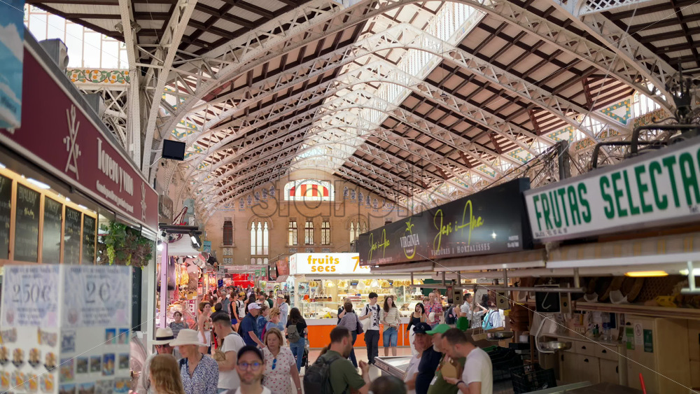 Valencia, Spain – May 28, 2025: People walking through the central market, under a rooftop Royalty Free Stock Video Footage