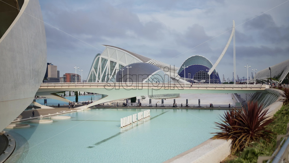 Valencia, Spain – May 28, 2025: White Palau de les Arts letters floating on the pool with the building’s sweeping forms behind Royalty Free Stock Video Footage