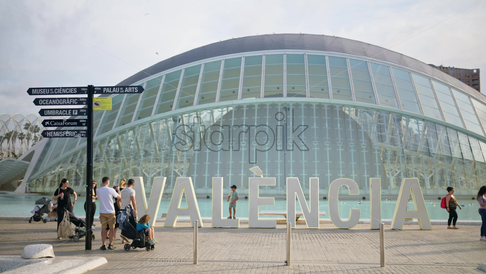 Valencia, Spain – May 28, 2025: White Palau de les Arts letters floating on the pool with the building’s sweeping forms behind Royalty Free Stock Video Footage