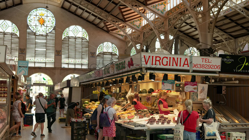 Valencia, Spain – May 28, 2025: Busy indoor market stall with citrus fruit and deli counters, with shoppers passing beneath hanging signs and neon lighting Royalty Free Stock Video Footage