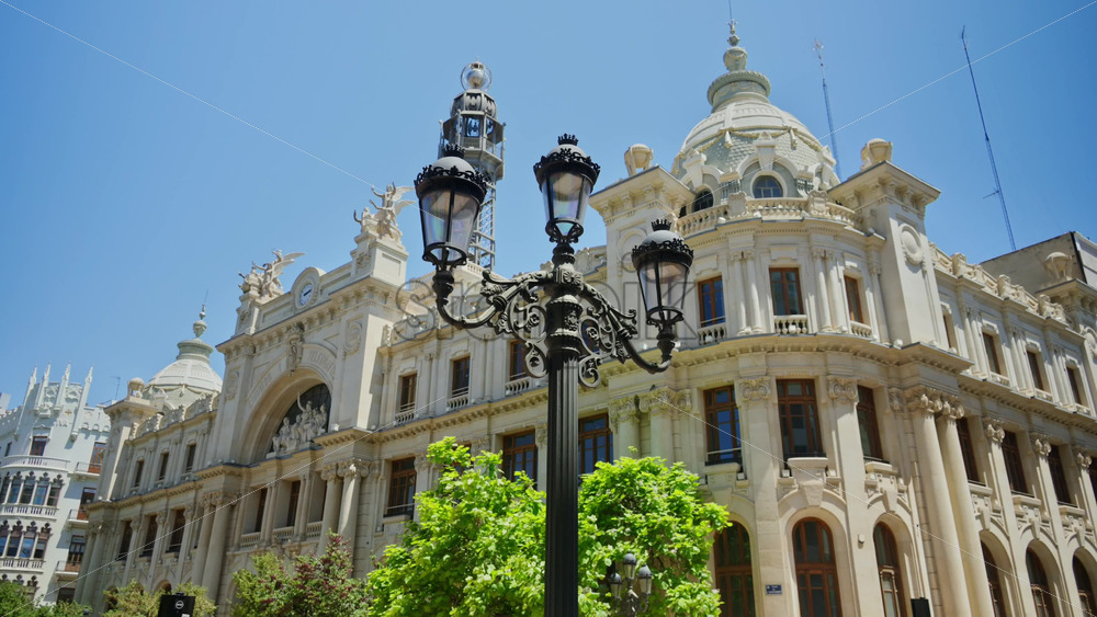 Valencia, Spain – May 29, 2025: Ornate Central Post Office with sculptural details and the metal communications tower behind a decorative lamppost. Royalty Free Stock Video Footage