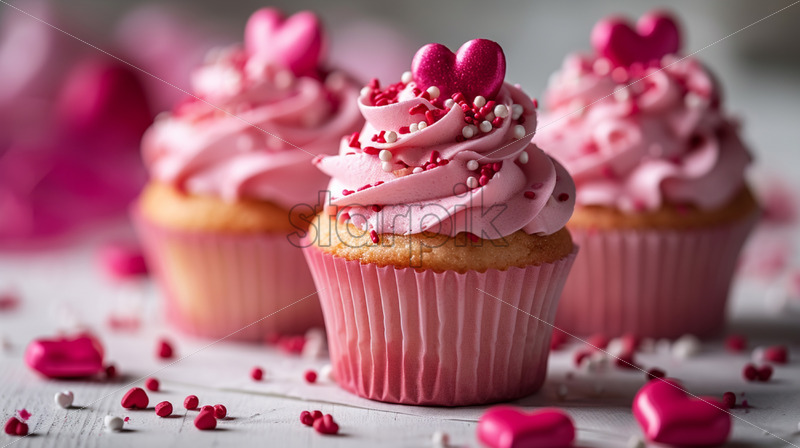 Home » Shop » Uncategorised » Valentine’s Day cupcake arrangement with pink frosting and heart-shaped sprinkles on a white isolate background