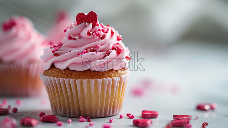 Valentine’s Day cupcake arrangement with pink frosting and heart-shaped sprinkles on a white isolate background