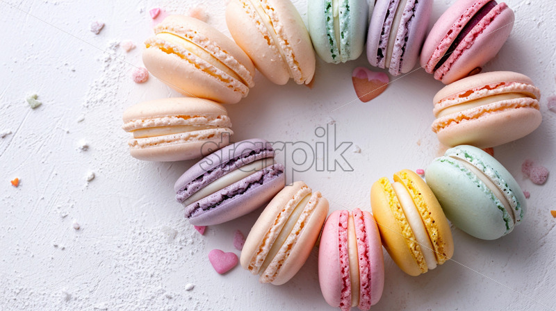 Valentine’s Day postcard with assorted macarons in pastel shades arranged in a heart shape on a pristine