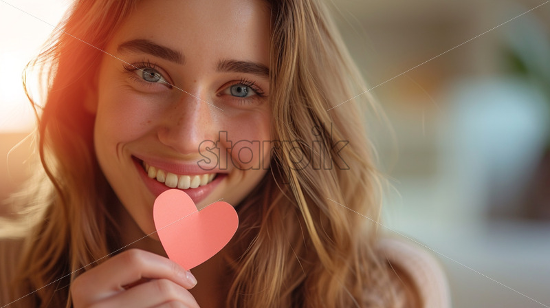 Valentine’s Day postcard with cute girl smiling with small paper heart