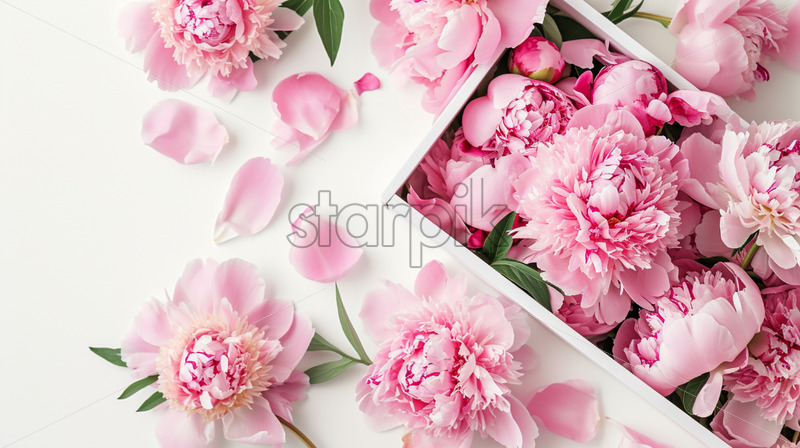 Home » Shop » Uncategorised » Valentine’s Day postcard with pink peonies in a box on white background