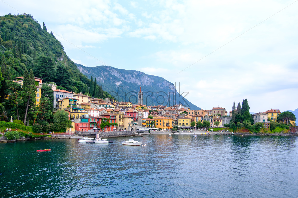 Varenna town at sunset with colorful buildings. Parked yachts. Lake Como, mountains and sky on background. Italy beauties Royalty Free Stock photo