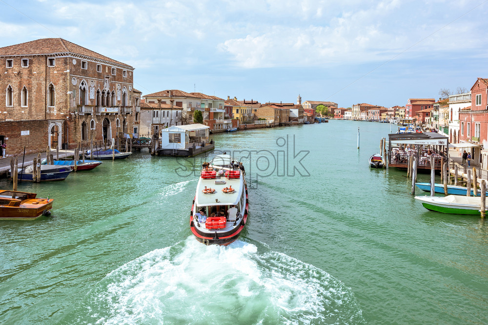 VENICE, ITALY – APRIL 02, 2017: Daylight view to transportation ship cruising to station in Venice Lagoon canal. Parked boats and people walking on sidewalk. Bright blue sky with clouds. Murano Island Royalty Free Stock photo