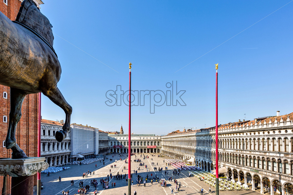 Home » Shop » photo » VENICE, ITALY – APRIL 03, 2017: Daylight view from Horses of Saint Mark to square with tourists walking and taking photos. Renaissance style buildings and open-air restaurants. Bright blue clear sky