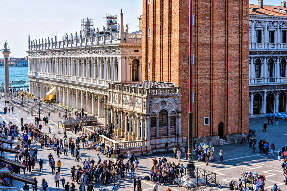 VENICE, ITALY – APRIL 03, 2017: Daylight view to Marciana Library renaissance style facade and campanile entrance from Saint Mark’s square overcrowded with tourists. Bright blue clear sky