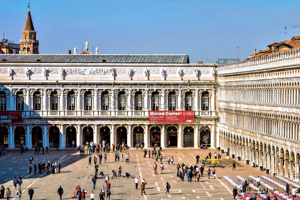 VENICE, ITALY – APRIL 03, 2017: Daylight view to Saint Mark’s square with tourists walking and taking photos. Renaissance architecture style buildings on background. Bright blue clear sky Royalty Free Stock photo