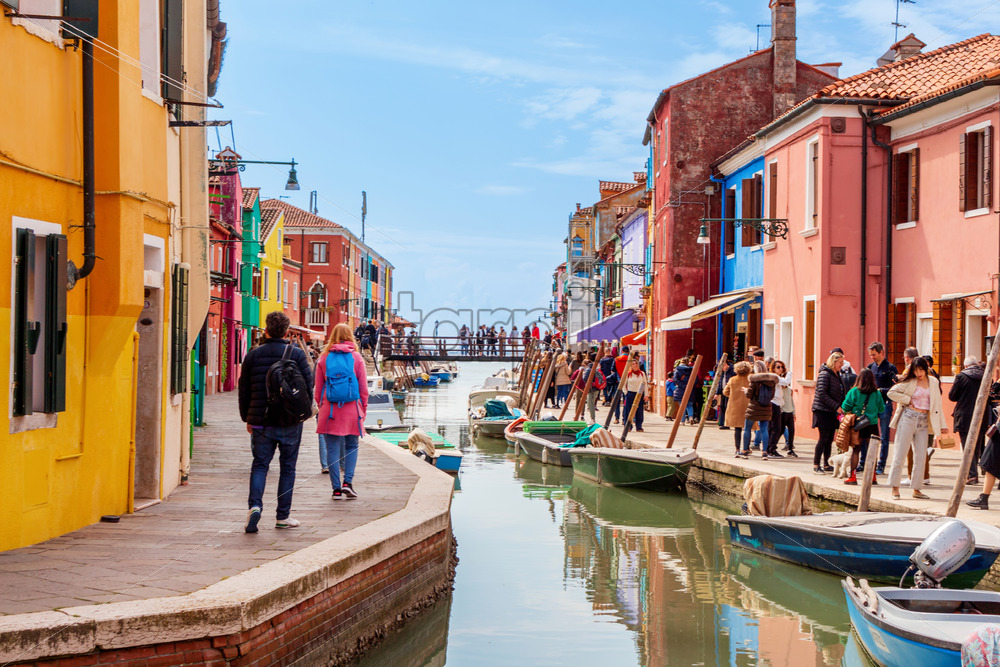 VENICE, ITALY – APRIL 9, 2023: People walking near a canal with floating gondolas and colourful houses in Burano