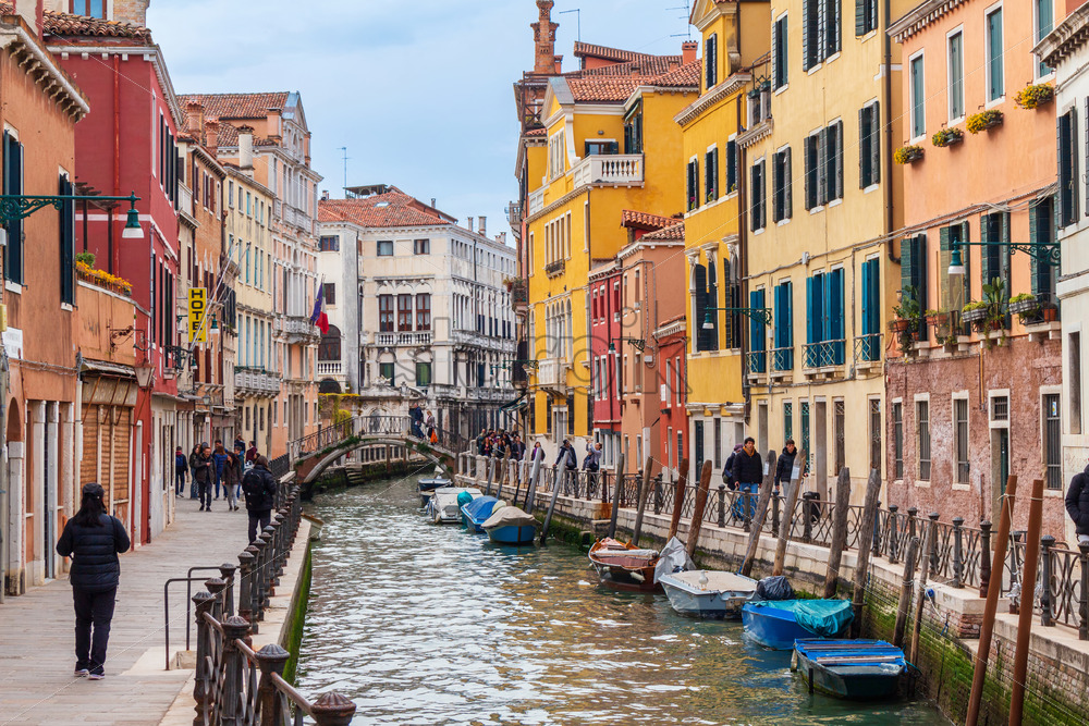 VENICE, ITALY – APRIL 9, 2023: View of Rio Marin Canal with floating gondolas and town buildings