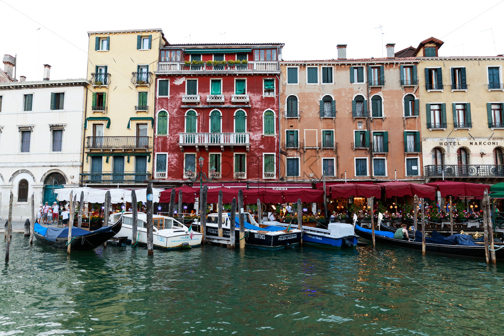 Daylight view from bridge to local canal with parked marine police boats and tall city buildings. Bright blue clear sky reflecting on water. Negative copy space, place for text. Venice, Italy