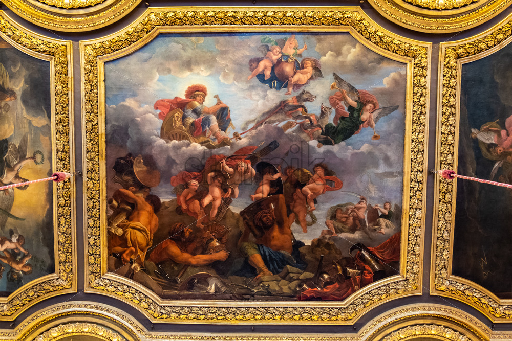 VERSAILLES, FRANCE – SEPTEMBER 29, 2018: Old art on the ceilings of the Versailles Palace. Golden decorations with wonderful images Royalty Free Stock photo