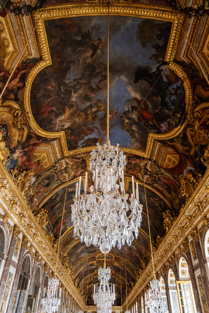VERSAILLES, FRANCE – SEPTEMBER 29, 2018: Old art on the ceilings of the Versailles Palace. Golden decorations with wonderful images Royalty Free Stock photo