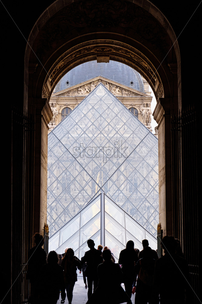 Vertical shot to people entering through the gates of Louvre. Symetric shot. Touristic locations in France Royalty Free Stock photo