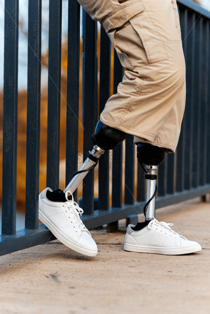Home » Shop » photo » Vertical view of a man with prosthetic legs and white sneakers. Rested one foot on the fence
