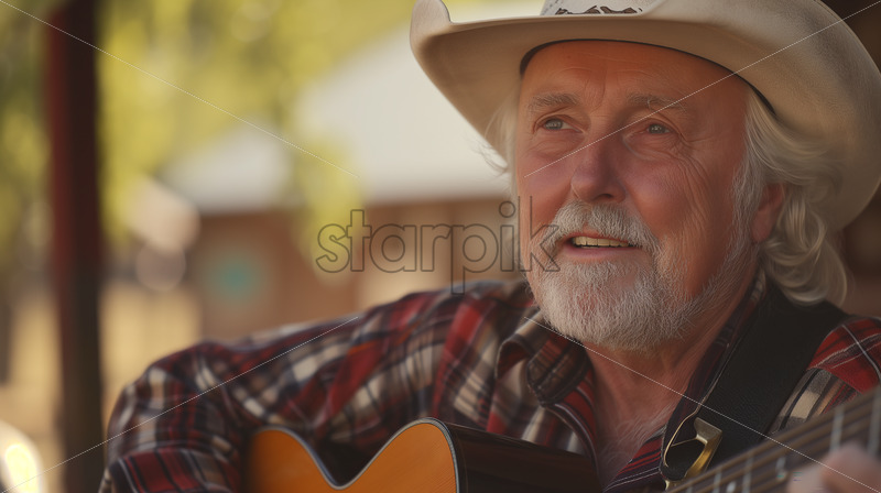 Bluegrass musician performs with rhythmic joy. The soft, natural daylight highlights the musician’s face, capturing genuine expressions of joy and a deep connection to musical roots.