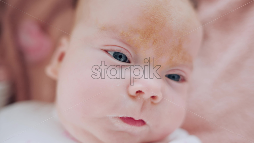 A baby lies on a soft blanket, smiling and looking toward the camera Royalty Free Stock Video Footage
