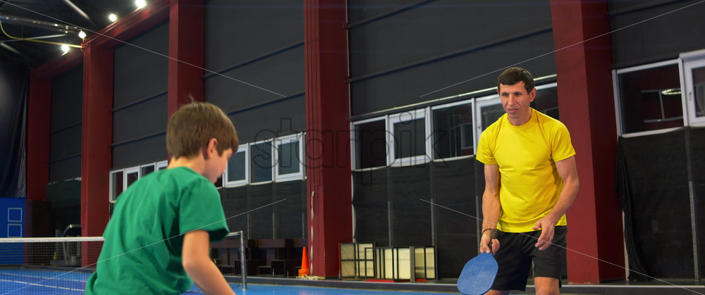 Video A man and a child training to play pickleball on a blue, inside court Royalty Free Stock Video Footage