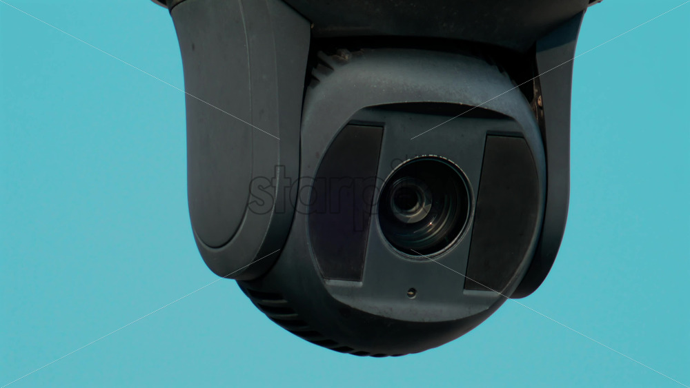 A close up of a modern black surveillance camera turning against a bright sky background Royalty Free Stock Video Footage