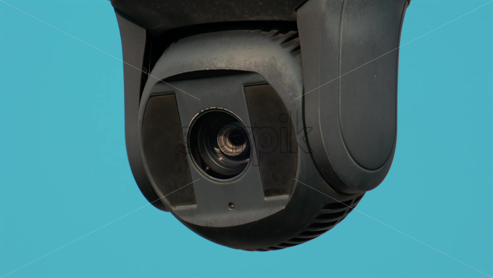 A close up of a modern black surveillance camera turning against a bright sky background Royalty Free Stock Video Footage