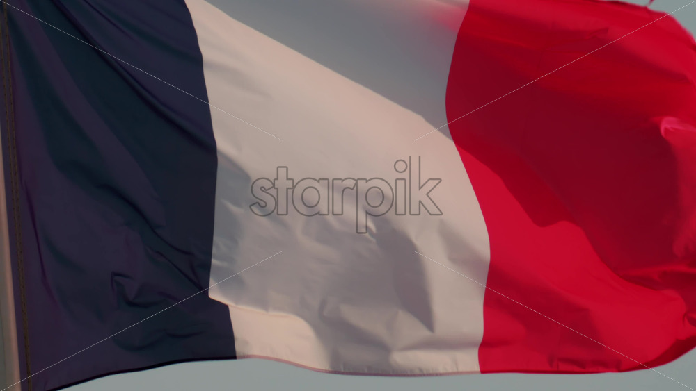 A close up of the French national flag waving gracefully in the wind under a clear blue sky Royalty Free Stock Video Footage