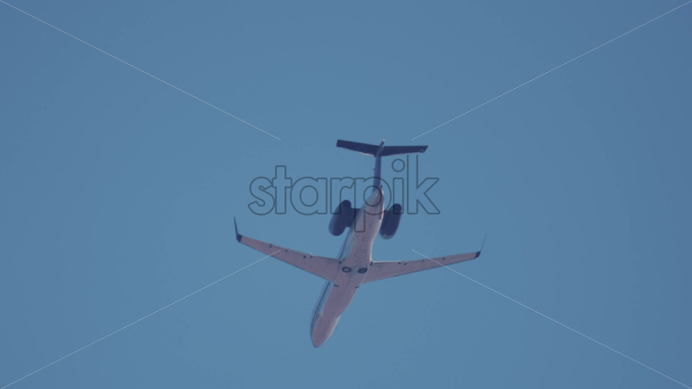 A commercial airplane flying overhead with clear blue sky Royalty Free Stock Video Footage