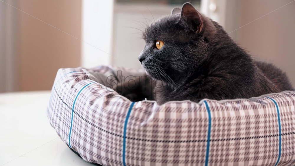 A domestic cat with dark gray fur and orange eyes lying on the couch, blinking and turning his head. Slow motion Royalty Free Stock Video Footage