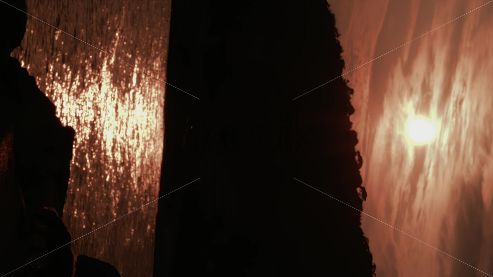 A dramatic sunset view showing a dark cliff silhouette with golden sunlight shimmering across the sea. Vertical Royalty Free Stock Video Footage