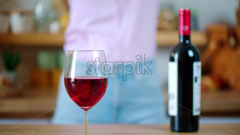 VIDEO A glass and a bottle of red wine standing on the table in front of a woman dancing in the kitchen Royalty Free Stock Video Footage