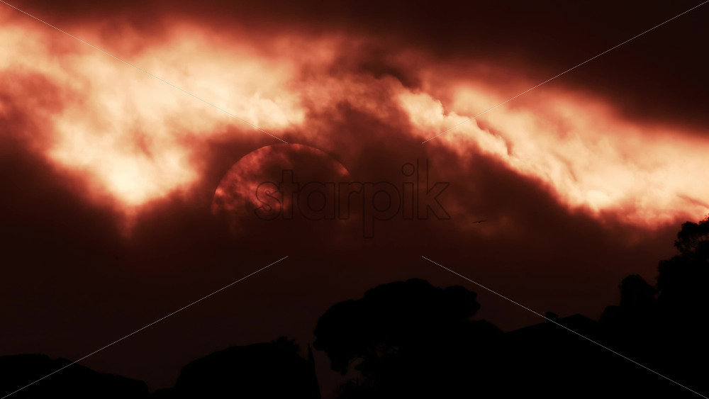 A glowing red sun partially covered by dark clouds at dusk Royalty Free Stock Video Footage