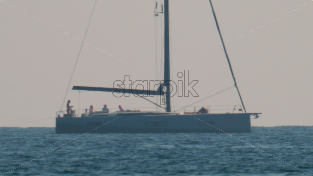 A luxury sailboat with several people onboard cruising peacefully across the calm Mediterranean Sea Royalty Free Stock Video Footage