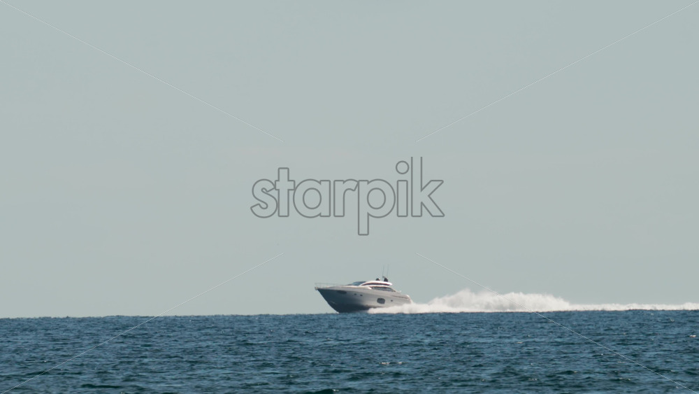A luxury speedboat racing across open blue water under a clear sky, leaving a long white wake Royalty Free Stock Video Footage