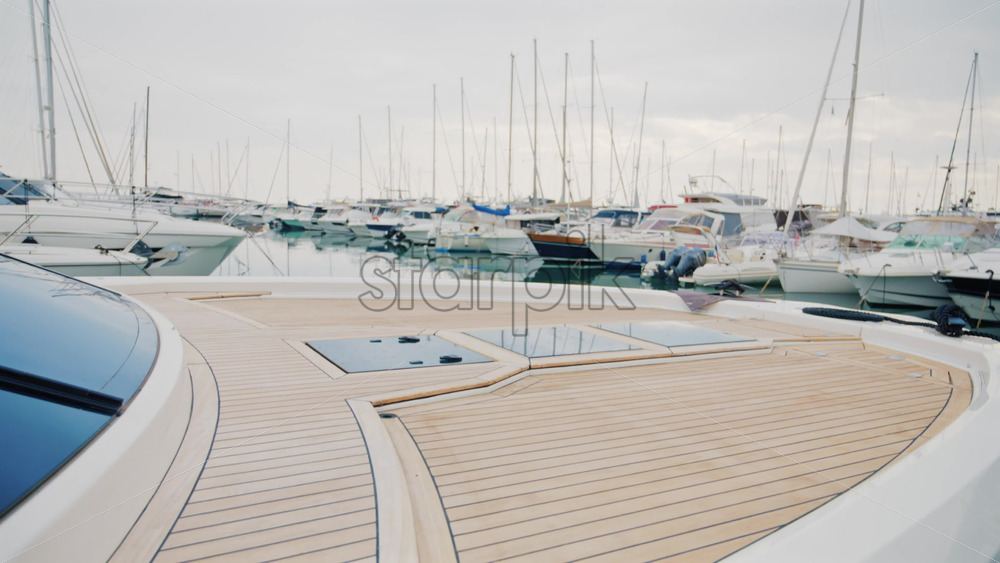 A luxury yacht deck overlooking a peaceful marina filled with sailboats and motor yachts under soft daylight Royalty Free Stock Video Footage