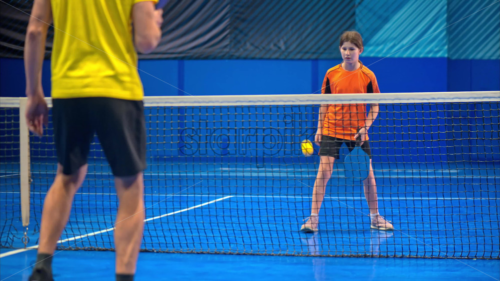 Video A boy and a girl playing pickleball on a blue, inside court Royalty Free Stock Video Footage