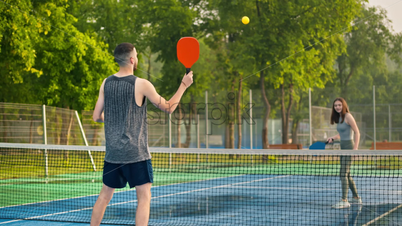 VIDEO A man and a woman playing pickleball at sunrise, after rain Royalty Free Stock Video Footage