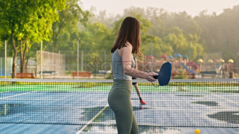 VIDEO A man and a woman playing pickleball at sunrise, after rain Royalty Free Stock Video Footage
