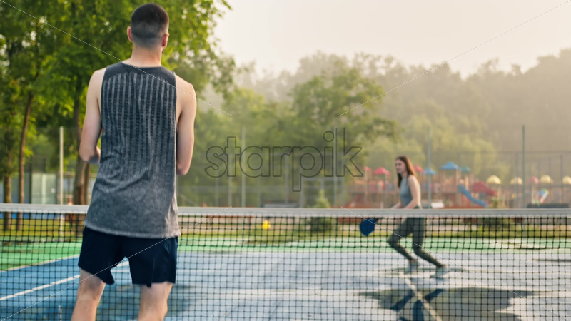 VIDEO A man and a woman playing pickleball at sunrise, after rain Royalty Free Stock Video Footage